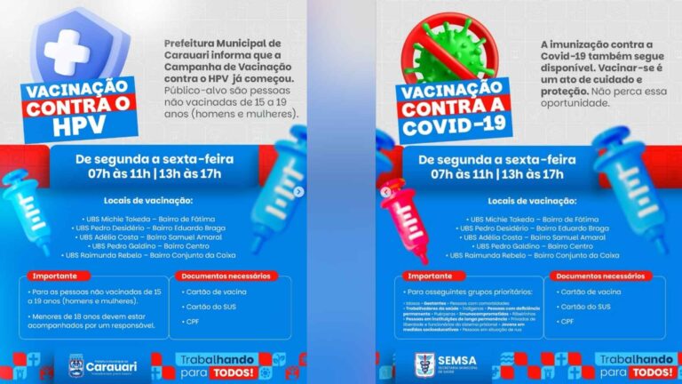 A Prefeitura Municipal de Carauari informa que a Campanha de Vacinação contra o HPV e a Covid-19 já começou! Proteja-se e cuide da sua saúde.